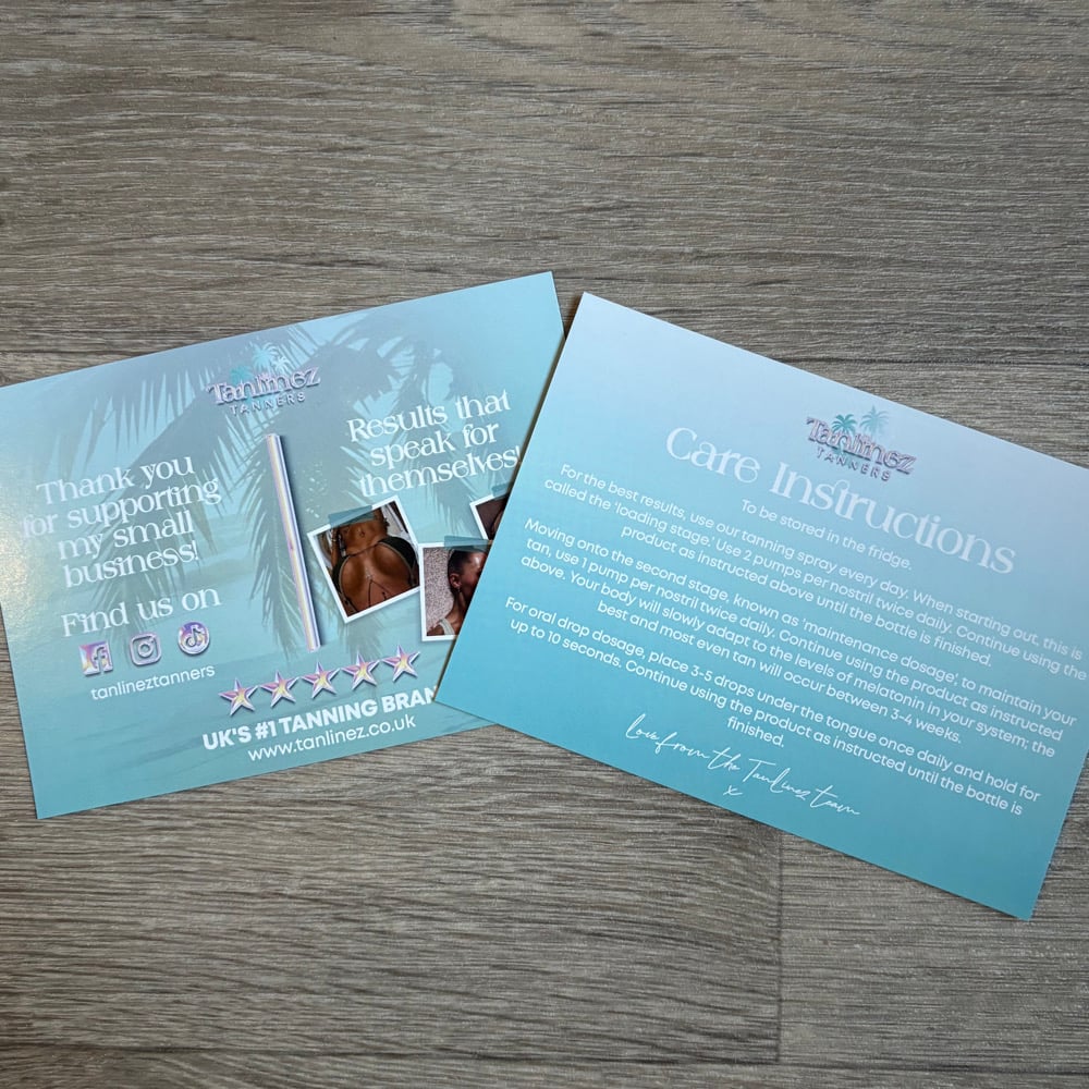 Perfect for showcasing your aftercare instructions, these premium A6 cards offer a sleek and professional finish. Printed on thick, high-quality 350 GSM silk paper, they’re ideal for including with product orders, beauty treatments, or client gifts.
